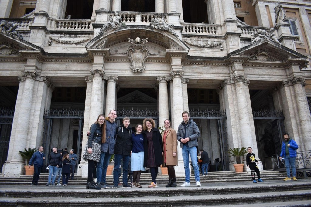 Op kleine afstand van deze ruïnes hadden we een gesprek met Amanda. Ze is katholiek met Joodse roots die in Rome woont en onderzoek doet naar Joods-Christelijke relaties. Met haar gingen we in gesprek over hoe zij haar geloof ervaart en konden we alle vragen stellen die we naar aanleiding van onze kerk bezoeken hadden opgedaan. Zo legde ze ons bijvoorbeeld uit hoe zij de heiligenverering ziet. Het liet ons nadenken over de vraag of wij als protestanten te veel vast zitten aan de kerk die we kunnen zien, terwijl ook de overleden gelovigen helemaal bij de Kerk van Christus horen. We kregen een mooi gesprek over wat het sacrament van het Heilig Avondmaal voor onszelf inhoudt. Dit gaf ons meer inzicht in hoe de rituelen rondom de Eucharistie werken. Door Amanda’s uitleg zagen we Calvijns wens om wekelijks het Heilig Avondmaal te vieren in een nieuw licht.